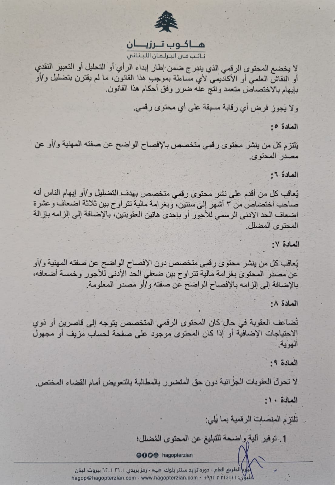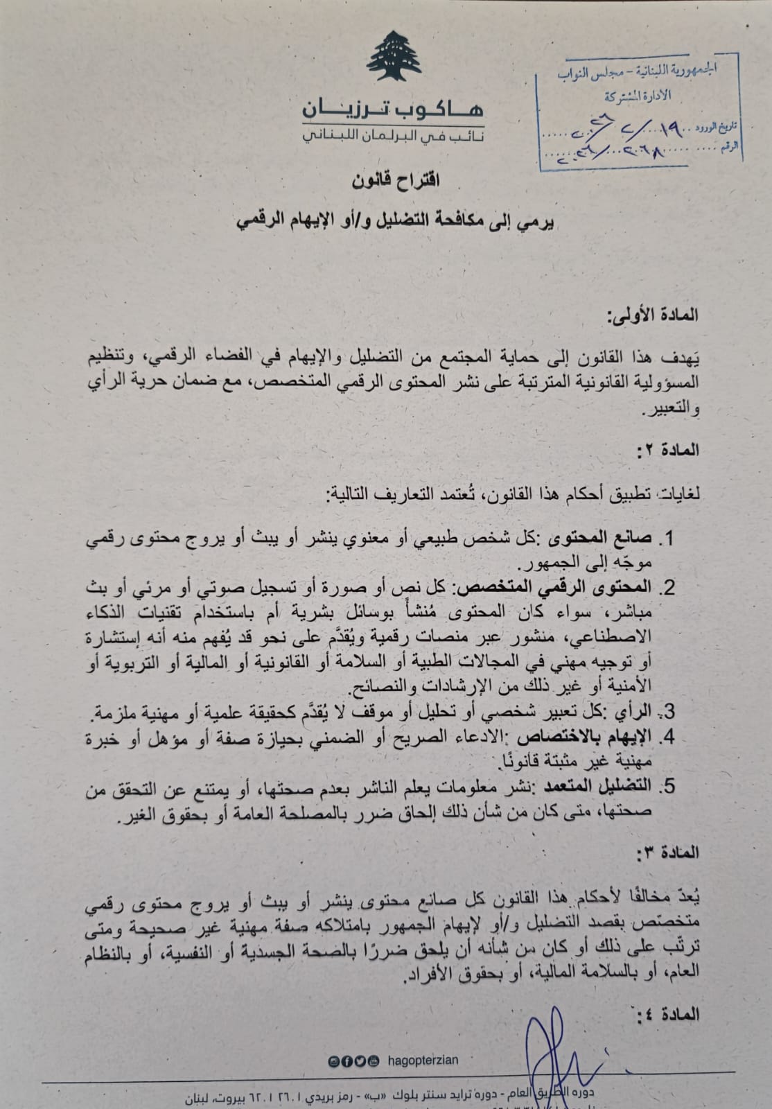في خطوة هي الأولى من نوعها ،وفي ظل النشر الرقمي المتفلت ، قدم النائب الأرمني اللبناني النائب هاكوب ترزيان الى الأمانة العامة لمجلس النواب إقتراح قانون لمكافحة التضليل أو الإيهام الرقمي، يهدف إلى تنظيم نشر المحتوى الرقمي المتخصص، من خلال إرساء مبدأ الشفافية والإفصاح عن الصفة المهنية ومصدرها، وتحديد المسؤولية القانونية المترتبة على إساءة استعمال هذا النوع من المحتوى.