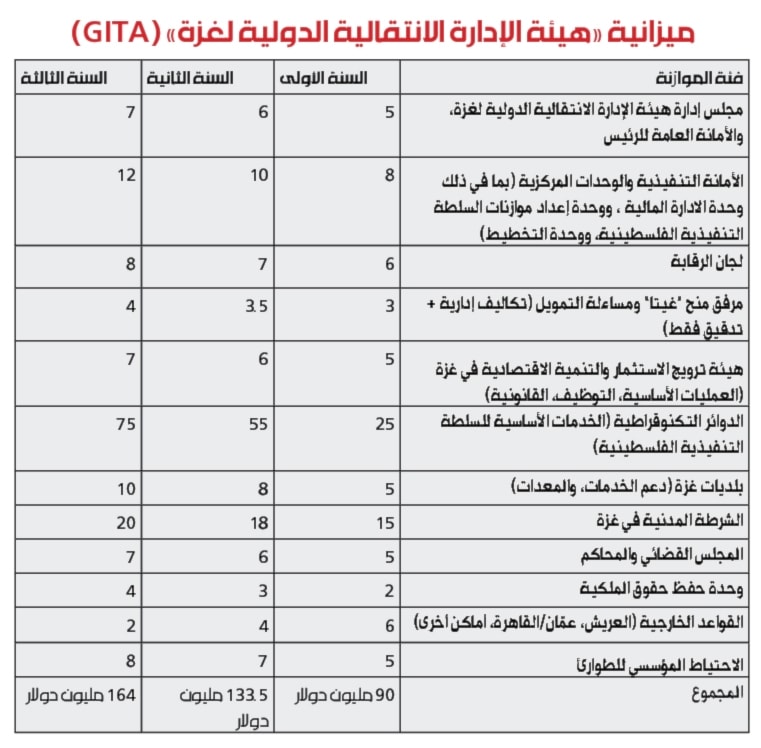 وإذ ينصّ المخطّط على إنشاء «وحدة حفظ حقوق الملكية» لحماية ممتلكات الغزّاويين في أثناء إعادة الإعمار، ويضع ميزانية متصاعدة تبدأ بـ90 مليون دولار في السنة الأولى لتصل إلى 164 مليون دولار في العام الثالث، فهو يشدّد على أنّ انتقال السلطة إلى الفلسطينيين مرتبط بأداء السلطة الفلسطينية وإصلاحها، وبالتالي لا يوجد جدولٌ زمني يُظهر متى ينتهي هذا الانتداب الجديد.