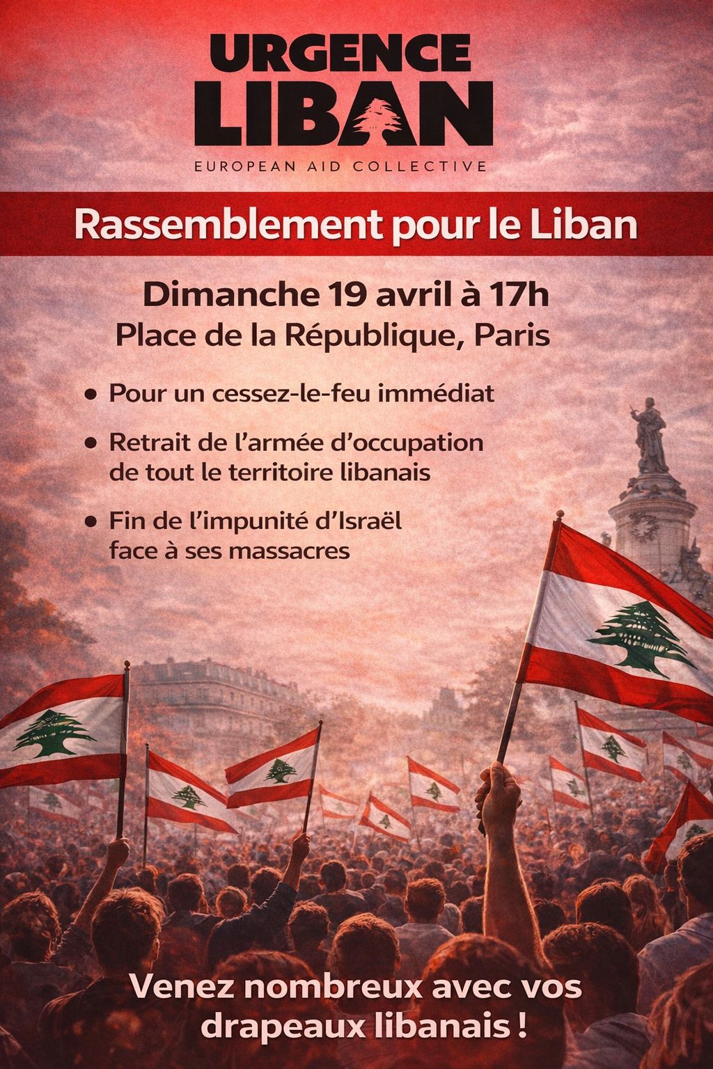 ويهدف التجمع، بحسب الدعوة، إلى حثّ كل من فرنسا والدول الأوروبية على اتخاذ موقف أكثر حزمًا، والضغط من أجل وقف العمليات العسكرية بشكل فوري، إضافة إلى التأكيد على وحدة الشعب اللبناني ورفض أي محاولات لزرع الانقسام أو التدخل في شؤونه الداخلية.