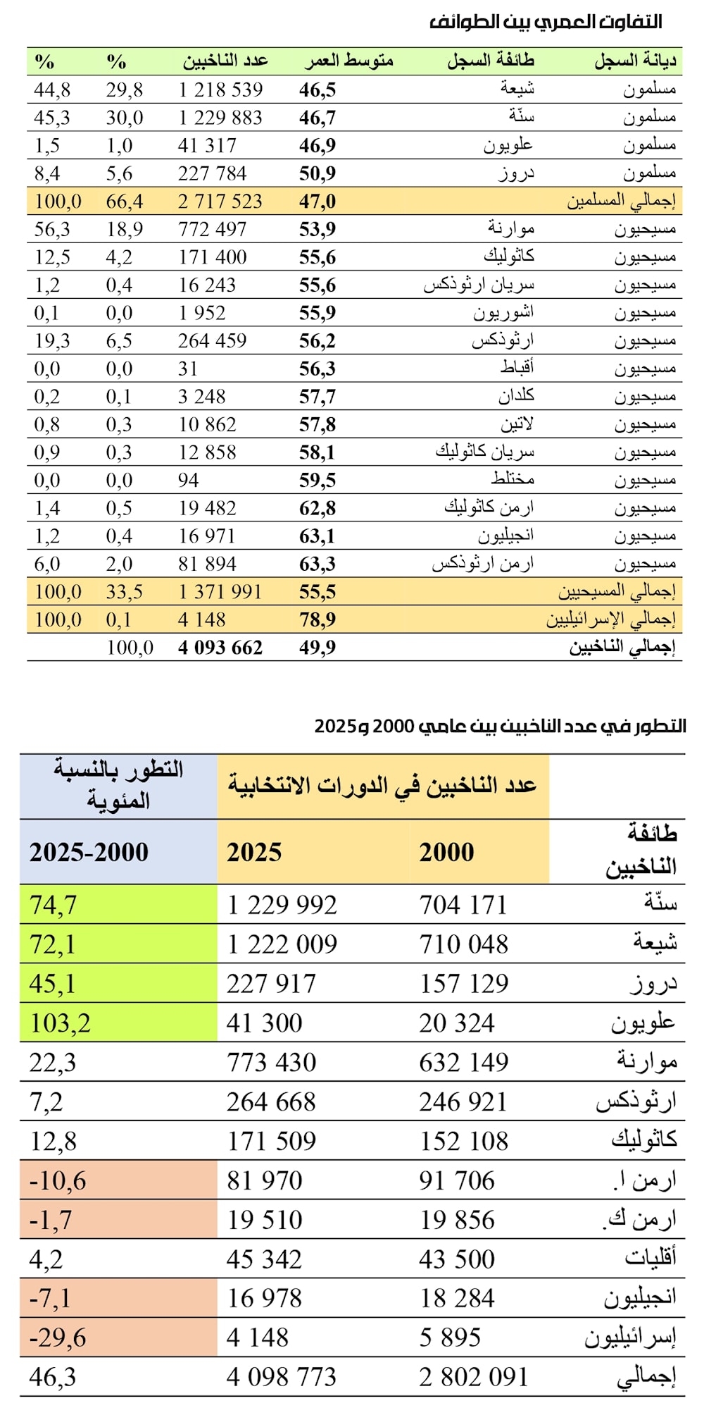 وتكتسب هذه اللوائح، وفق الباحث كمال فغالي، قيمة قانونية شاملة لأنها تشمل جميع أصحاب حق الاقتراع، بمن فيهم غير المقيمين والمجنّسون، وإن كانت لا تشمل الفئات دون سنّ الحادية والعشرين. وتكشف المقارنة بين اللوائح اختلالاً واضحاً في الفارق العمري بين الناخبين المسلمين الذين يبلغ متوسط العمر بينهم 47 عاماً ويشكّلون 66.4% من مجمل الهيئة الناخبة، و55.5 عاماً للمسيحيين الذين يشكّلون 33.5% من الناخبين وفق لوائح قيد آذار 2025.