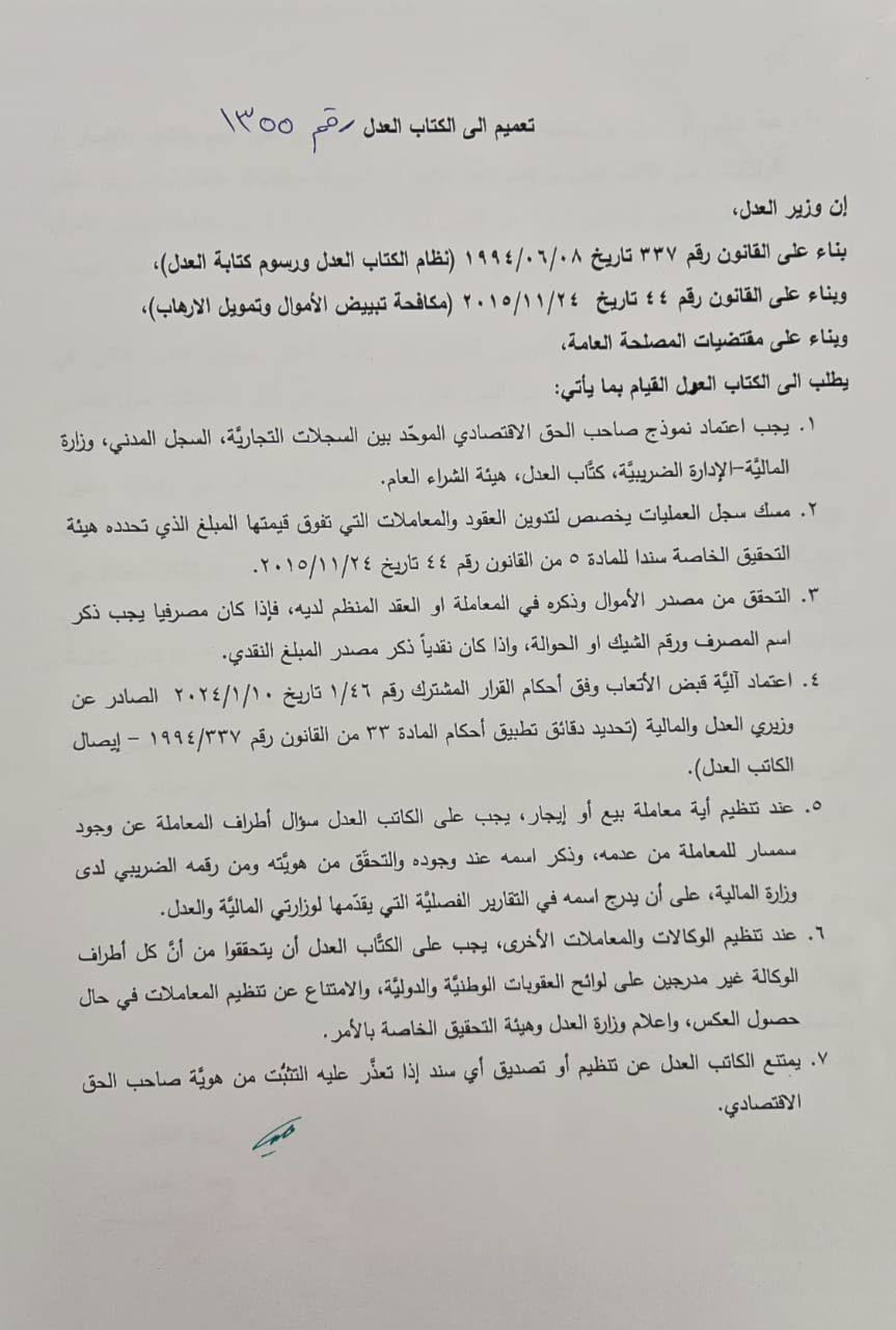 ويستند التعميم إلى القانون رقم ٣٣٧/١٩٩٤، الخاص بتنظيم مهنة الكتّاب العدل والقانون رقم ٤٤/٢٠١٥، المتعلّق بمكافحة تبييض الأموال وتمويل الإرهاب. وهي إجراءات تعيد تشكيل عمل الكتّاب العدل وفق قواعد تخالف القانون العام، وتشكل اعتداء على حرّية التعاقد والأهلية القانونية.