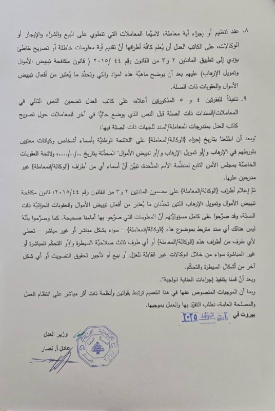 وفيما يدّعي الوزير أنّ التعميم يهدف إلى تعزيز مكافحة تبييض الأموال، لكنّه «يطرح مشكلات قانونية وحقوقية». وقال قانونيون لـ«الأخبار» إنه «إجراء يفرض على الكتّاب العدل التزامات تجعلهم ممثّلين لسلطات رقابية دولية ويقيّد حرّية التعاقد والأهلية القانونية. وفي ظلّ غياب آليات تنظيمية لحماية البيانات وحق الاعتراض والتعويض، فإنّ مخاطر التعسّف والفوضى تزيد».