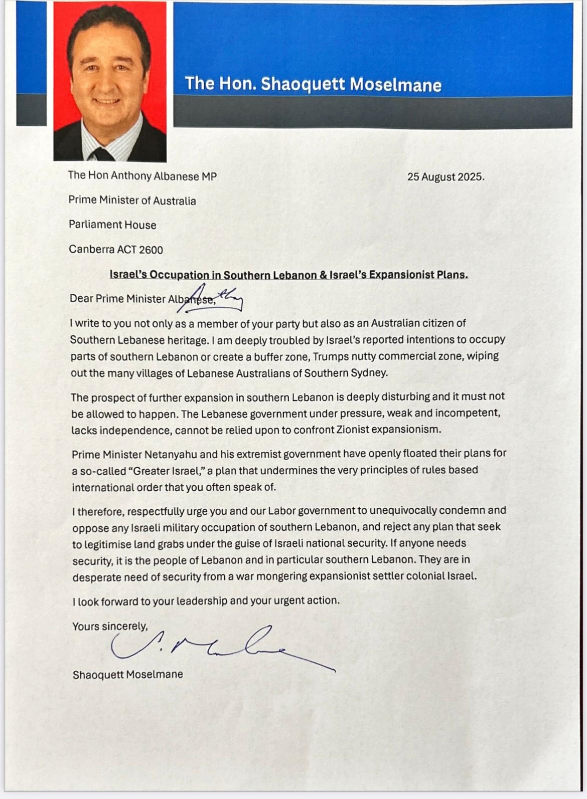 وجه النائب الأسترالي السابق شوكت مسلماني رسالة إلى رئيس وزراء استراليا أنتوني ألبانيزي ناشهه فيها إتخاذ موقف واضح وصريح في إدانة ومعارضة أي احتلال عسكري إسرائيلي للجنوب اللبناني.